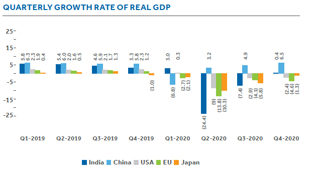 In the concluding months of FY2021, growth in e-way bills, railway freight, steel consumption, automobile sales and electricity generation were observed. This indicates V-shaped recovery of the economy. The necessary interventions by the government helped the economy revive from the low of Q1FY2021 to register a small positive growth of 0.4% in GDP in Q3FY2021.