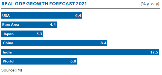 The IMF has projected an impressive 12.5% growth rate for India in 2021. This suggests that India’s GDP growth rate is likely to be the fastest in the world among the major economies in 2021. The large-scale capital expenditure announced by the Government of India in the Union Budget 2021-22 will support economic activity and investment. The capex cycle, triggered by the government, is likely to crowd in private investment, which is expected to drive economic growth, and consequently, more opportunities for business and employment generation. However, the recent surge in COVID-19 cases in India may pose some constraints in the growth prospect of India.