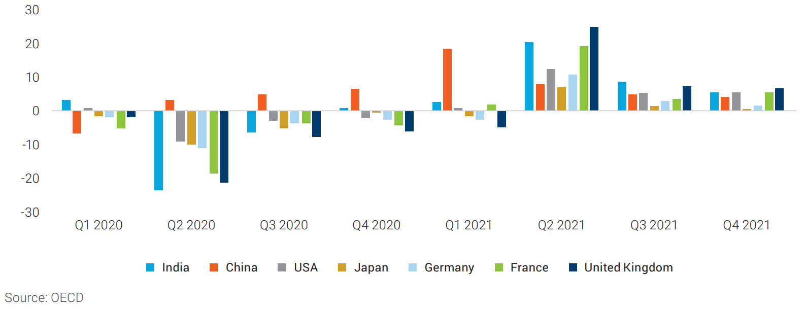 European Union witnessed record growth in the first half of 2021, following resurgence of domestic demand, modest consumer spending and healthy growth in public and private investment. Rise in COVID-19 infections, high energy prices, particularly that of natural gas, supply chain disruptions together with geopolitical tension between Ukraine and Russia impacted Europe’s economic recovery, leading to uncertainties. The European Commission estimates annual inflation to reach 3.5% in 2022. Inflation rose 4.8% in Q1FY2022, mainly driven by supply bottlenecks, high energy prices in the short term and worsening of the standoff between Ukraine and Russia. Overall, despite challenges caused by supply-chain disruption and high inflation, most economies witnessed modest growth in 2021 due to the low base effect and recovery in economic activities.