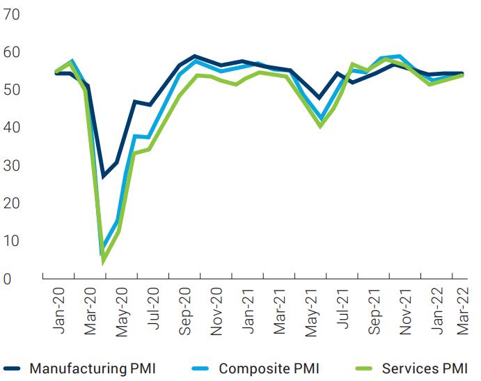 The manufacturing sector saw healthy growth in 2021, with the Purchasing Managers’ Index (PMI) remaining in the expansionary zone (i.e., above 50) levels since Jun’21 despite the challenges caused by the second wave of the pandemic. The service sector is also expected to grow by 8.6% in FY2022 as steady recovery has been observed in service PMI since August’21. The strong support provided by the government’s stimulus packages, increased infrastructure spending and an accommodative monetary policy of the Reserve Bank of India (RBI) have assisted India to sustain its economic recovery