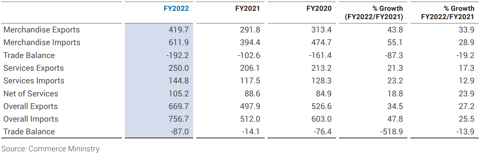 India registered highest ever merchandise exports of US$419.65 billion in FY2022, which is 43.8% higher than FY2021 and 33.9% more as compared to exports made in FY2020. Indian exporters were able to take advantage of global supply disruptions and high commodity prices in the global export market in FY2022. Service exports also grew by 21.3% in FY2022 to reach US$250 billion.