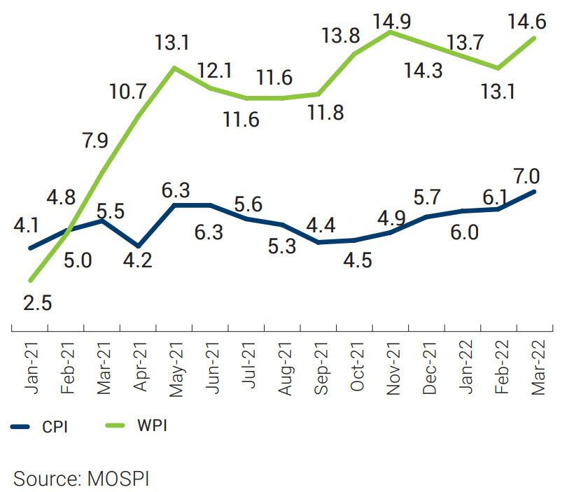 However, India’s inflation rate as measured by Consumer Price Index (CPI) remained high in FY2022, briefly dipping in September 2021 before picking up to 6.95% in March 2022, breaching the upper tolerance limit of 6%. High energy prices, particularly crude oil prices, drove the Wholesale Price Index (WPI) to the second highest level since 2004. The Reserve Bank of India has maintained an accommodative monetary stance, keeping the repo rate unchanged while maintaining a strict watch on the inflation level. Although central banks of some countries have already started considering reversing their pandemic-time expansionary monetary policy by taking a more hawkish stance, the RBI has considered it necessary to retain a commensurate accommodative policy to enable the economy to recover further with focus on keeping inflation in its target range.